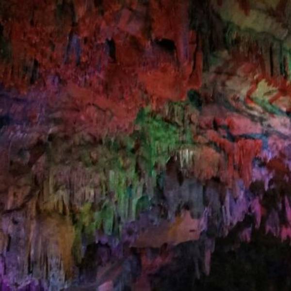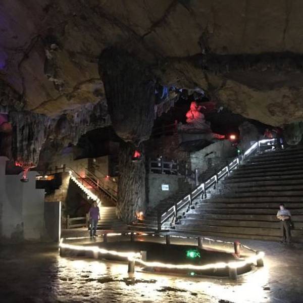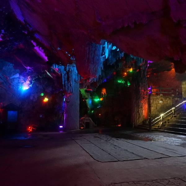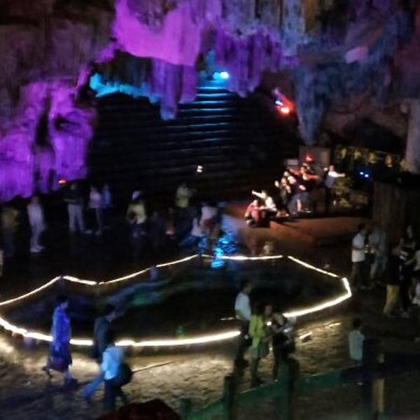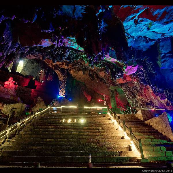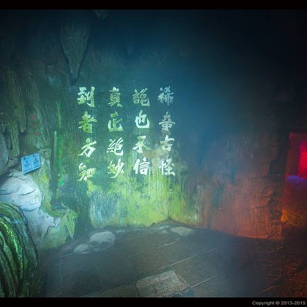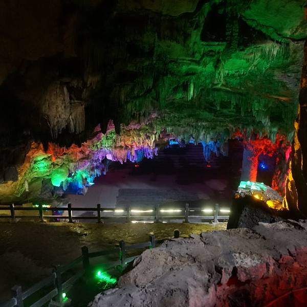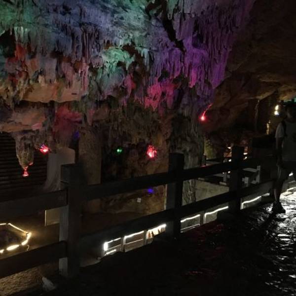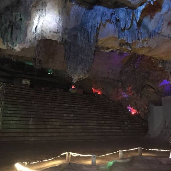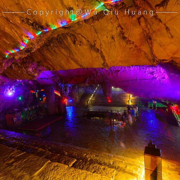一个洞连着一个洞,走路时一定要小心哦,注意头上,路比较窄,灯光不是很好。张公洞内的游程约1500米,从下洞进入是“海屋大场”,里面石钟乳、石幔、石花琳琅满目,在灯光的映射下五光十色。