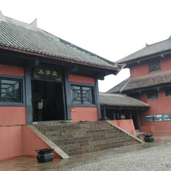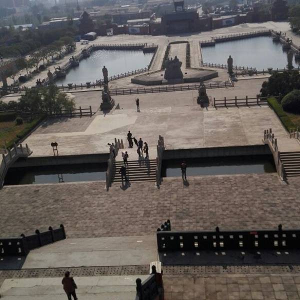 售票处位于影视城的正门处,门票为每人四十元,学生证等证件可以打折优惠。检票之后,沿着正门的石阶而上,便到达影视城的第一处核心区域,这边有孔子像,旧皇宫等建筑,周围摆放着十八般兵器,游客可以在这边合影留念。