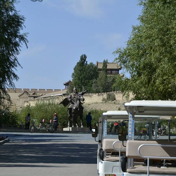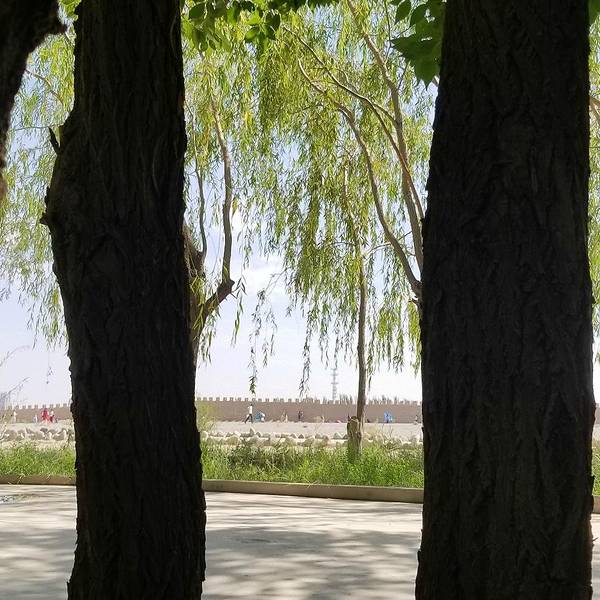 往里走是一处碑亭,碑正面书“天下第一雄关”!由于拍照的人太多,就径直往里面走了。首先看到的是古时遗留下来的土城墙,在戈壁荒原上更显沧桑!人们都站在铺满大圆石块的地上以后面的城关为背景纷纷拍照,我找了找角度,发现效果一般就只拍了两张景就继续往里走了。在城关前的广场上,大片的人群聚集,有一处邮局和几处商铺,我和孩子去买了一套明信片,父母在椅子上休息,说我们不用管自己去玩,我们就分开行动了。在城关左侧是处戏台,正在表演当地的戏曲,台下稀稀拉拉站着部分感兴趣的游客,戏台正对的是城关的侧面,有个门洞相连,通过门洞到城关后面,快出门洞时就是看到下面这张照片!通过后能看到上城门的阶梯,就拾级而上。台阶内侧是平面的坡道,说是供战马通行。一些孩子都跃跃欲试,在上面艰难爬行。上到城墙上面,视野顿时开阔,一眼苍茫!环顾四周,憾然于城镇化对历史遗留的包围,远处能看到田地和建筑物以及待建的工地!抬眼望向更远处,是祁连山吧!仔细看竟然能看到山顶的积雪!太意外了!沿着左手边的城墙向出关的方向走着,随时将美景收入镜头!出关后游人纷纷在有嘉峪关三字的城关处拍照,我则走上土坡向更远的方向找寻。一眼望去远处有一个亭子,应该也是碑亭。掺杂在我与碑亭中间的就是已经商业化运作的骑马、射箭、沙地卡丁等项目以及供游客返回的复古老爷车(买票后可到达入口处)。想着找明信片上的最佳拍全景的地方,就继续向右手侧走去,走了一会看到几个外国友人也在向远处走去,就跟了过去,转过关墙的右手边拐角,就看到不远处空地上停留的老爷车,一拨拨游客拍照后就上车走了。我也跟着几个外国友人走去,他们拍完照离开我也正好走到,试着拍了张,效果不错,就是这张!全景观赏地拍的,依稀能看到远处祁连山顶的白雪!也见有几个游客顺着图城墙外侧继续往前走,应该能走到前门,想想还是不要冒险,就原路返回。返回到出关城门处,再看看远处的碑亭,孤寂地矗立在那,决定走过去一探究竟。步行穿过骑马区域,径直走过去,亭下有一人在拍照后乘凉,我就在不远处拍了几张,碑上面书字“天下雄关”!临近出口,人们都在这片树荫下乘凉休息!原路返回在广场与他们会合后一起在上面这处树荫下休息片刻,就到下摆渡车处排队坐车出景区。然后按导航搜索市区小吃,导航遇到修路也是不灵了,就兜兜转转走到一条胡同,发现一家牛肉面,就它了。进去一看价位公道,人也不少,65以上老年人还有优惠,点个赞。面的味道属于清淡的,跟我们当地经常吃的苏氏牛肉面相似,比较对胃口,5个人都要了大份。美美饱餐后稍事休息就往晚上落脚处进发。高速路上看到雅丹观景点,就下车爬在上图这个地方拍的这张不怎么起眼的照片,不过漫漫黄沙映衬下,大白还是很健美的!住的地方是提前一天就在网上定的瓜州春雨酒店,下午4点到店后发现确实如网上评论的停车场超大,很方便,房间也大。我们的房间上楼一看正对着电梯口,就下楼交涉又换了一间靠里面的,进门后一看比刚那间还要大!价位超值,一间160。带早餐。瓜州春雨酒店,房间超大,门前广场超大停车场!休息到晚上8点多,决定出去吃饭,照例老妈和孩子不想去,在酒店等我们带!这点以后一定要纠正,出来玩不了解当地风情不行的啊!只好我们仨开车去了,十几分钟的车程就到瓜州市场了。旁边就是停车场,市场大门口都是卖水果的,往里走是临街的各种商铺,也都把摊摆在各自门口。再往里走就能看到广场上的夜市摊了,他们这边的羊肉串摊很有意思,一个U字形的条形桌子围着烧烤炉,外面是一圈小凳子,人们就点了后围坐在小摊吃!羊肉串的摊子散落在一片一片的夜市摊的周边。我们8点多到的,夜市摊人不多,就先在周边看看,看到一座美食城,就上去看看,二楼和三楼但是,空间不算大,因此充斥着油烟的味道,看看就下楼了,径直走到楼天广场的摊位前,随便找位置坐了。三个人要了两个炒菜,一份羊肉串,一分羊腰子。其实在等的过程中就发现旁边的的羊肉摊是正宗的维族老爷爷在操作(围坐的人也多),而我们摊主推荐的是一个一看不太着调的年轻人的摊子(最后觉得老板两个也不是本地人)。在等的过程中拿桌子上瓜子消遣,老爸照例拿出自带的白酒,我要汽水、果啤都没有,就到附近的超市去买了汽水。最后结账时才发现瓜子也是收费的,8元。而一路上别的地方瓜子都是免费的。人生地不熟,不纠结直接结账走人。临走到开始看过的粥店要了粥和包子,回去给他们两个吃。