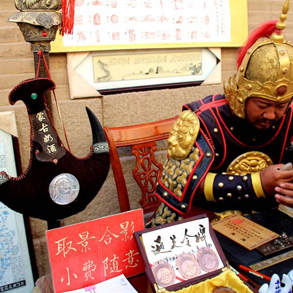 看有工作人员穿上将军的盔甲写通关文牒一类的东东,价格也不贵 款式不同的20 30的都有