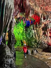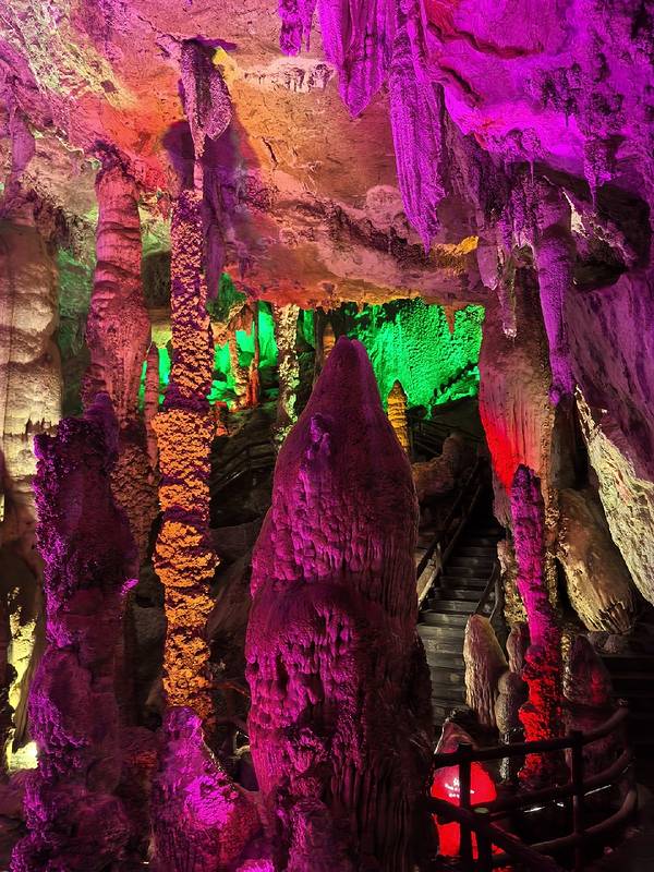 💎神女宫/雄狮厅:溶洞里的视觉盛宴!五彩灯光打在形态各异的钟乳石、石笋上,红、绿、紫、黄的光影交织,把亿万年的地质奇观变成了梦幻舞台。抬头是垂落的石幔,低头是湿润的步道,像走进了地下宫殿,震撼又神秘。