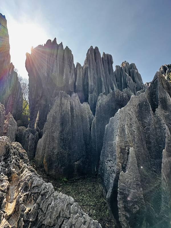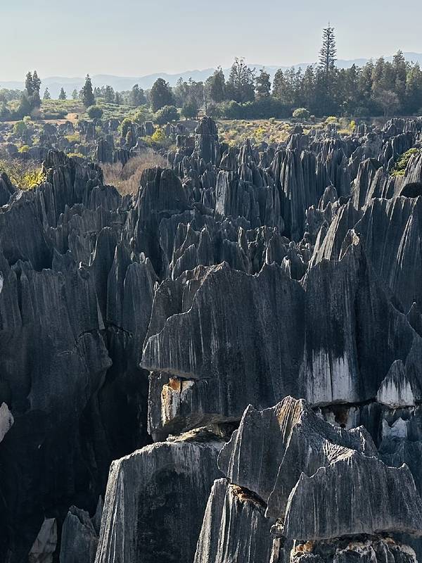 俯瞰整片石林的绝佳位置,万千石笋如刀似剑,层层叠叠铺向远方,搭配远山与树林,像走进奇幻森林。