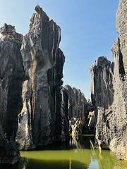 跟着导游参观完大石林,我们来到小石林。这是一片以“阿诗玛”化身的石像为主要标志的小型石林。这里有草坪、有水池,还有绿树,这将给一个个长相秀丽的千姿百态的黑色石柱赋予了生命活力,所以阿诗玛就在这里留下踪迹。有了水的映衬,似诗更像画。
