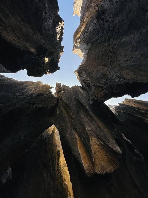 高耸石峰形成的天然夹缝,阳光从缝隙中漏下,形成丁达尔效应,明暗交错超有电影感。