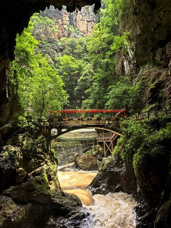 🌉叠虹桥:跨在峡谷上的木桥挂满红灯笼,从溶洞出口望出去,桥身与青山、流水构成一幅绝美的画卷,是拍全景和人文感照片的绝佳机位。