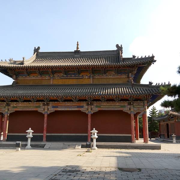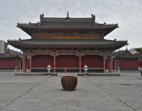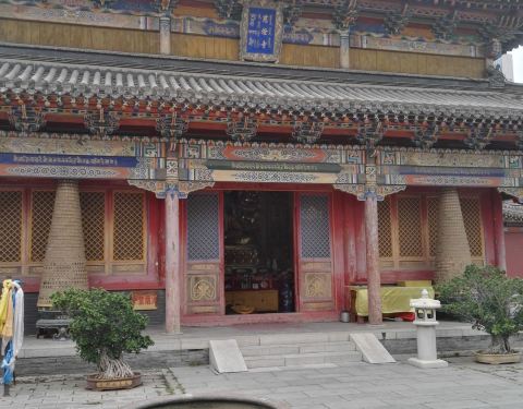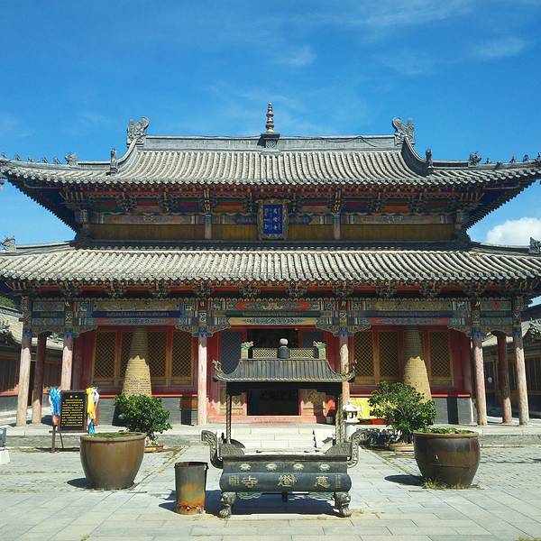 五塔寺原名慈灯寺,位于呼和浩特旧城东南,五塔只是慈灯寺内的一座佛塔。曾经寺院建筑全都坍塌只剩下这座佛塔,因此才有后人得知此处有寺院,重建时便名为五塔寺。五塔寺是一座藏传佛教寺院,也是蒙古地区藏传佛教的发源地。 五塔寺的南面面对五塔寺广场,入口也在此处。五塔寺布局是典型的汉族的中轴线特色,中轴线南北走向,两边严格对称。寺内共分为三个院落,分别是南边的三世佛殿院,中间的文化展院和北边的慈灯寺院。五塔寺的面积不大,纵深仅有150米左右。 从五塔寺南门进入寺院,园内靠南处两边各有一座白色小塔,具有藏传佛教特色。正对面是三世佛殿,三世佛殿在建筑上既有汉族宫殿的特色,又有少数民族和藏传风范,这也是整个寺院建筑的大体风格。 穿过三世佛殿后来到中间的院子,对面的建筑上清晰大字写有“呼市召庙文化展”。在召庙文化展建筑内部,左侧的墙上挂有历史上的宗喀巴等人像,右侧列有我国现存金刚座舍利宝塔召庙图,体现了呼和浩特召庙文化的渊源流长。 然后来到北边的院子,院子中间是慈灯寺的大殿,大殿背后便是舍利宝塔。这座舍利塔始建于清雍正年间,高约16米,塔身均以琉璃砖砌成。参观五塔寺时不光可以在外面观看,还可以上到塔座顶上,俯视全寺,视野不错。 在舍利塔背后的北墙处有一座蒙文天文图石刻,天文图直径144.5厘米,画有二十八宿赤经位置的经线,还有五个同心圆。