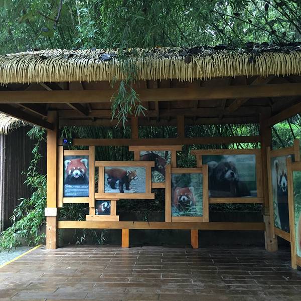 接下来是小熊猫的区域,小熊猫在开放的空间里,我们下山走的栈道,时不时的就会看到小熊猫出没。导游说不要去招他,因为小熊猫可能会抓人。听起来挺凶猛的啊,我们经过小熊猫,他都会欠欠的用小爪子扒拉我们,管我们要吃的,一副贪婪的模样。。下山路上 经过放映厅,会讲解一下大熊猫的生长过程,很可爱的。循环播放。大约也就十分钟吧,顺便可以休息休息,门口有个纪念品商店,价格还可以,不过并没买什么。