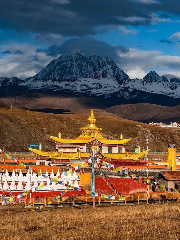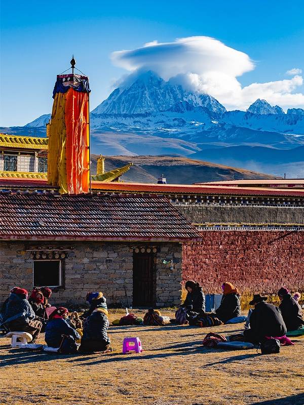 眼前恢弘大气的木雅大寺和严峻陡峭的雅拉雪山同框的画面,是人文风光佳的结合。强烈建议在塔公镇住上一晚可以将日出日落一饱眼福。日出日落前一小时到达机位用长焦镜头拍摄。