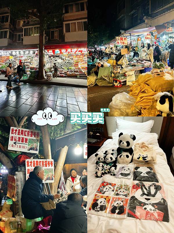 [樱花R]Day1:下飞机冲宽窄巷子,买了网红熊猫爷爷的熊猫伴手礼,去益民菜市场买了特产(🈵100可以包邮寄回去[偷笑R])。晚饭去奎星楼吃了冒椒火辣,签子6毛一串,平价美味!