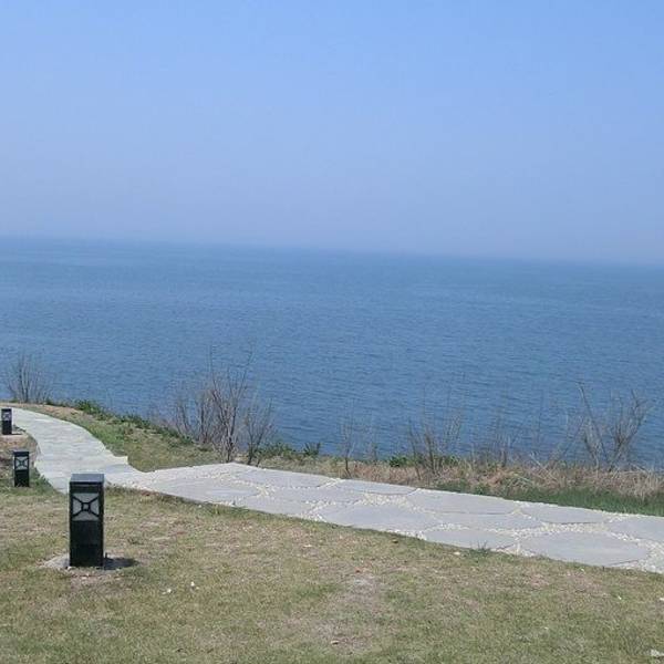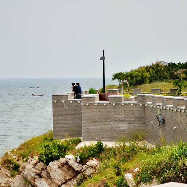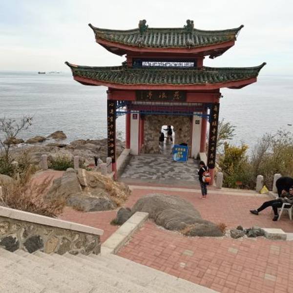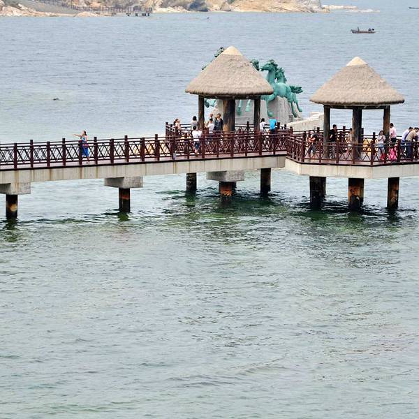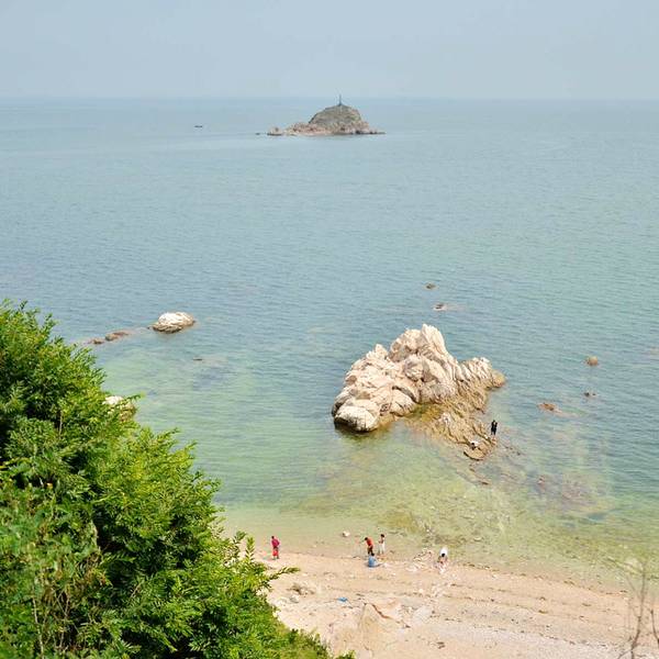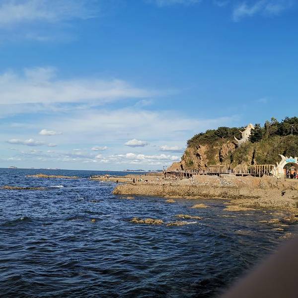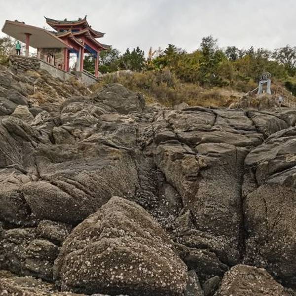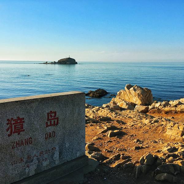 由人工天梯连接到陆地,小岛不大,就是一个在海里突起的小山峰,上面有三个景点:馒头礁、裂岩壁画和乌龟礁- 养马岛