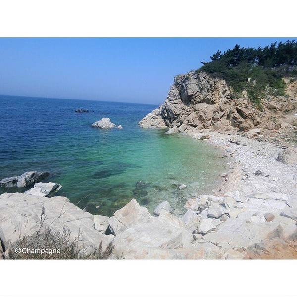 就乖乖的走了。。。獐岛位于养马岛的东南部,是在海里面的一个小岛,由人工天梯连接到陆地,小岛不大,就是一个在海里突起的小山峰,上面有三个景点:馒头礁、裂岩壁画和乌龟礁。