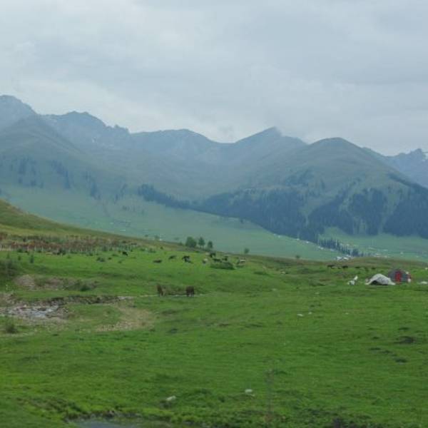 吃完饭接续赶路,那会儿开始下雨了,车队逐渐接近那拉提国家森林公园。