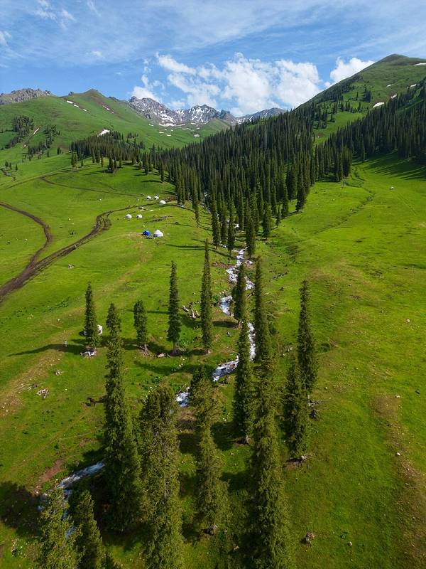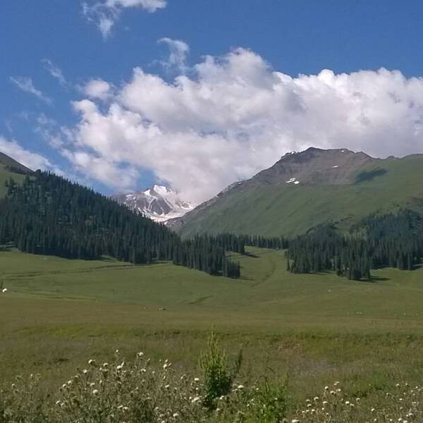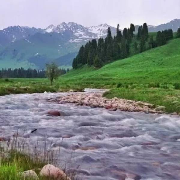 沿巩乃斯河前行,河水清澈,林木葱茏。可乘区间车至“塔吾萨尼”站,拍摄雪山倒影;傍晚在河畔露营野餐,感受大自然的宁静。