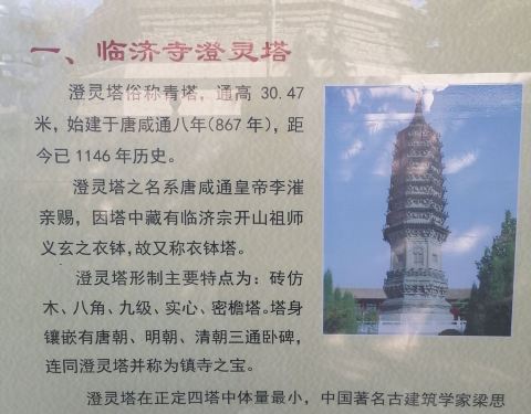 临济寺澄灵塔始建于唐朝,俗称青塔,是收藏临济寺义玄禅师的衣钵而修建的,为一座砖砌八角塔,共有九层