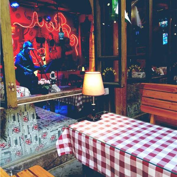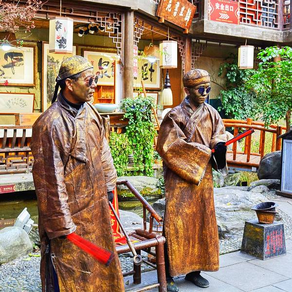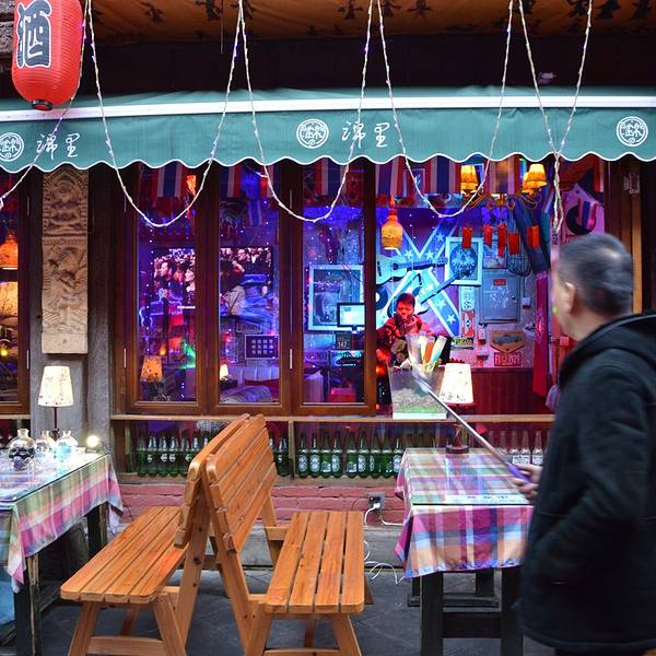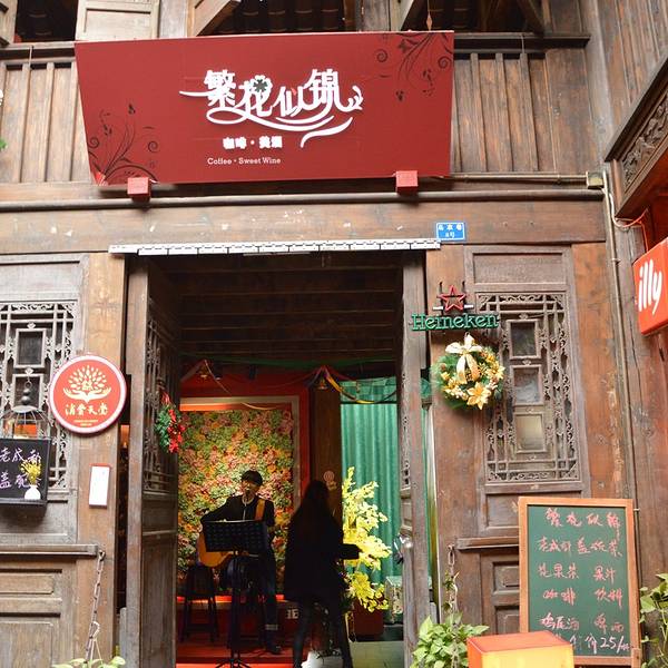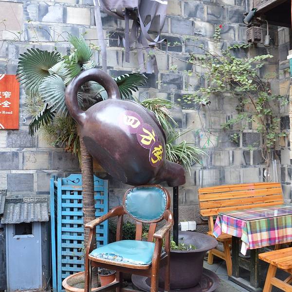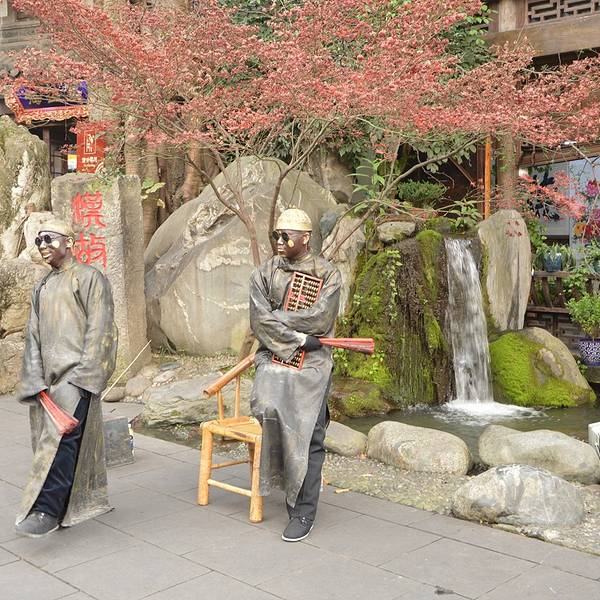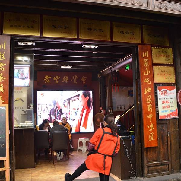 我们从武侯祠三义庙那个后门过来就到了锦里古街,不足400米长的老街林立着各类老成都传统的小吃和特色商铺。三大炮、牛肉焦饼、糖油果子、叶儿耙、伤心凉粉、各类肉串是这里的主角,小吃的价格在5元左右。锦里的伤心凉粉酱料很足,价格也不贵,一份五元。确实辣,但不一定辣得人流泪。爱吃辣的四川人到了异乡吃不着辣,想必才会想念得流泪吧。三大炮是师傅现场表演,糍粑从木板中弹跳而过,跃进放于木板上方的装有黄豆面的簸箕内,发出“碰、碰、碰”三响,然后从簸箕内把糍粑团每三个拣为一盘,浇上红糖,撒上芝麻,即为“三大炮”。小吃很多比较辣和油,每家店尽量少买点,免得越到后面想吃都无能为力了。待的长一点的则推荐去茶馆和酒吧坐坐,茶是大碗茶,吃饭喝茶还可以看表演,喝茶加看表演一般50元一位。