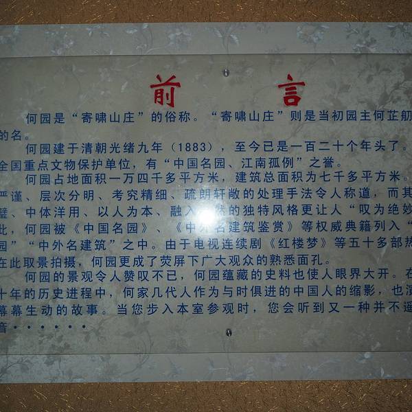 …………………………………………...何园又名”寄啸山庄”,被誉为“晚清第一园“,面积1.4万余平方米,由清光绪年间何芷舠所造,房屋的建造吸收了西方建筑的优点,颇有中西合璧的味道,是清后期扬州园林的代表。