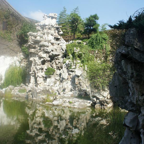 贴壁假山在船厅后侧风火墙上紧贴墙壁堆叠着一组长达六十余米的假山,上有盘山蹬道,下有空谷相遇,水绕山谷,山上有月亭,过月亭可登上复道回廊,形成全园上下立体交通