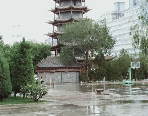 俗称木塔广场,实际好像叫万寿寺,地方不大,东面是一座木塔,西面有一个大殿。门前晚上都是跳广场舞的,灯光明亮,十分热闹。
