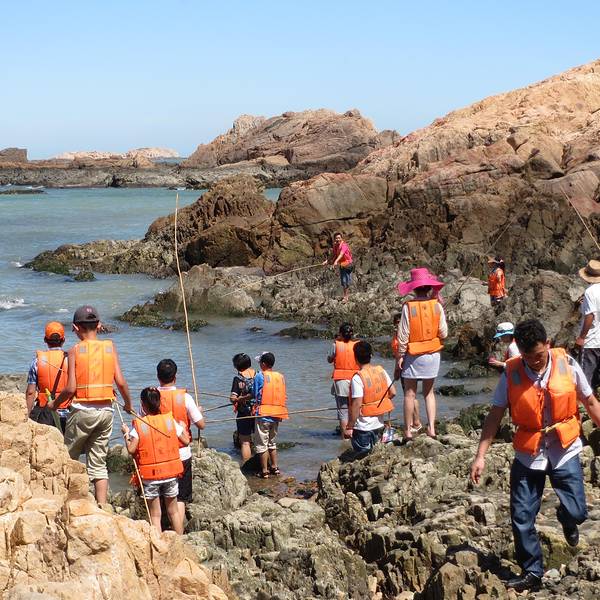 吃了早饭(宾馆提供),参加渔家乐海上活动,码头有停车场,去一个小岛游玩2小时,每人60元,坐船出海撒网鱼放笼捕蟹,岛上矶钓,每人免费领一根吊杆,岛上这么多游客,只有我一个人钓到了一只蟹,顿时举岛欢腾。岛的名称叫“小鸡金屿”。岛上有人卖烧烤,简单而味美。