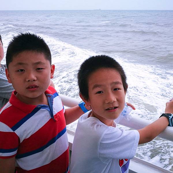 三娃待船一启动就按耐不住,全跑到甲板上呆着了。由于风浪,船晃的挺厉害,走路跌跌撞撞的。三娃跑到最前方的甲板上,看着浪花一个个扑打上来,显得超级兴奋,尤其到了后面,一个浪花猛的一扑,小轩童鞋一个闪躲不及,全身湿透,另外两个娃顿时“哈哈大笑”。渐渐的,海水变得绿起来,清澈起来,在太阳的照射下,像一块碧玉闪着迷人的光泽。虽说是普通客轮,但觉得速度也挺快的,一小时左右就到了嵊泗的泗礁码头。下了船,走到停车场,全是出租车、黑车候着,所以不用担心下了船没有车。由于订的套餐含接送,我们就原地等待,不一会儿,一辆面包车来了。我们上了车,一路狂驶,来到基湖村。套餐中含的住宿位于基湖村比较偏僻的地方,说好听点就是幽静,说难听点就是荒僻,好在老板娘还不错。房间设施什么的就不要要求太高,反正我们家都自备。放下行李,大家略微修整,打算去基湖沙滩逛逛。走过去大概15分钟,也可以坐公交车,k003路,大概3-4站路。整个基湖沙滩外围被围的严严实实,进去必须买票,白天60元/人,晚上20元/人。感觉好不值得,所以我们就在门口的广场上逛了一圈,正好感到肚子饿了,大家决定先晚餐。 展开