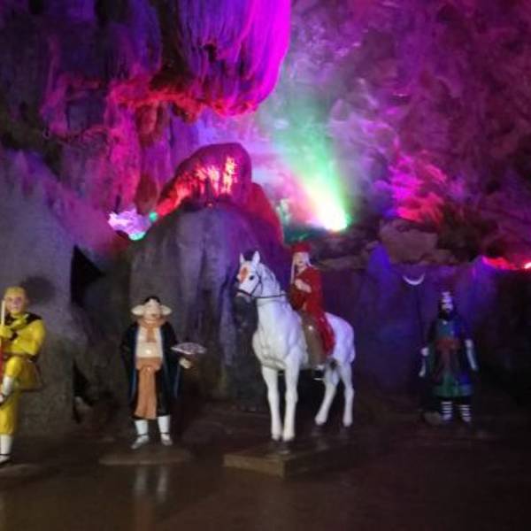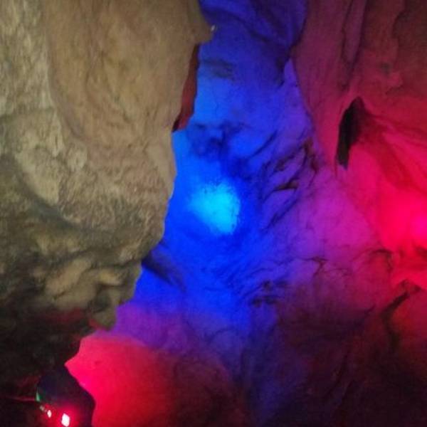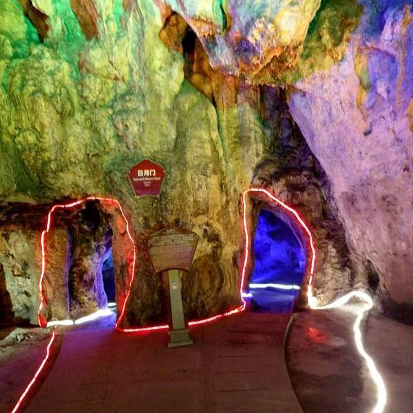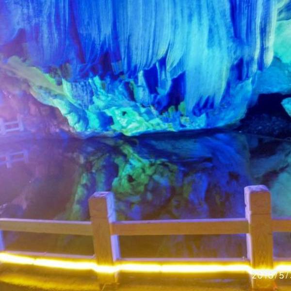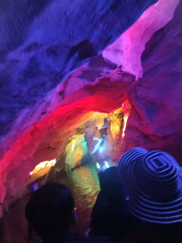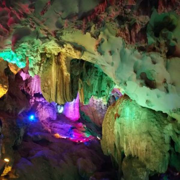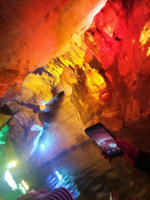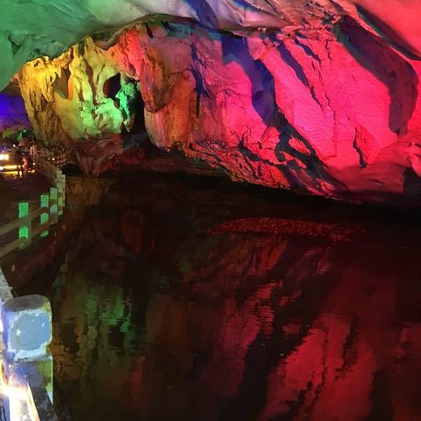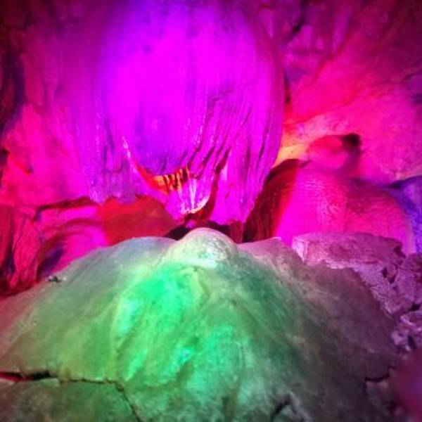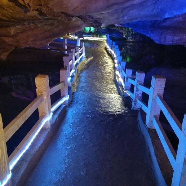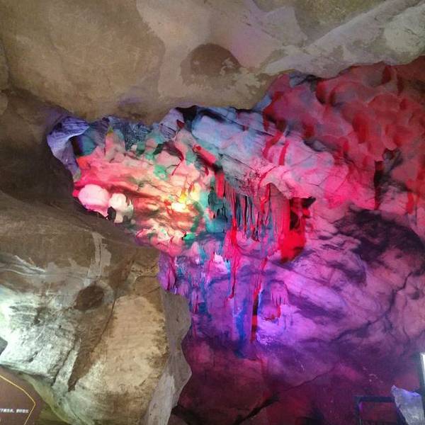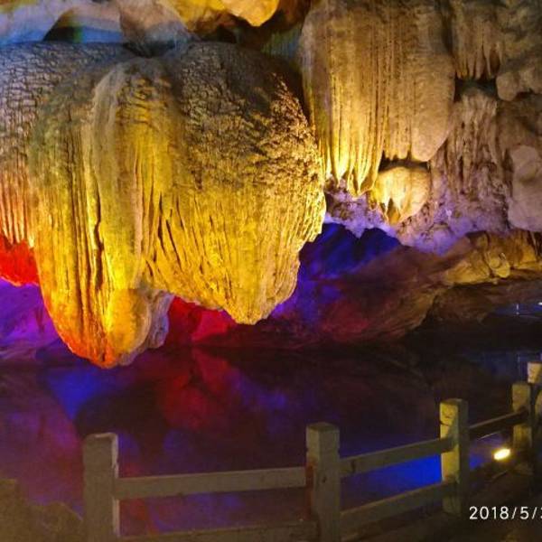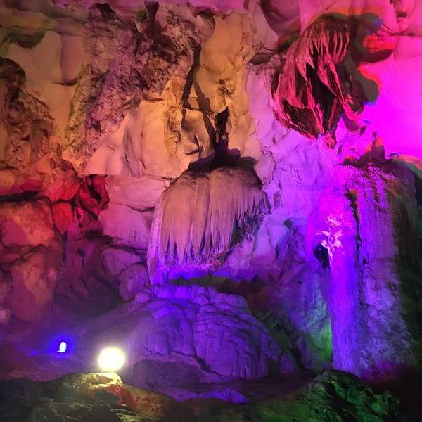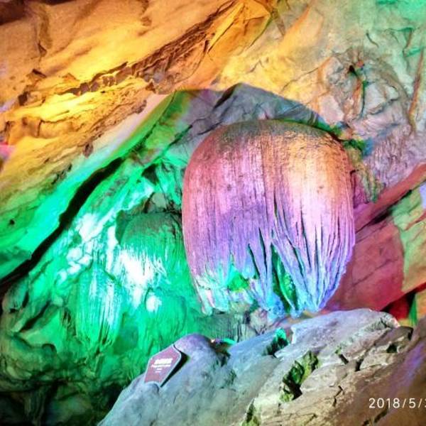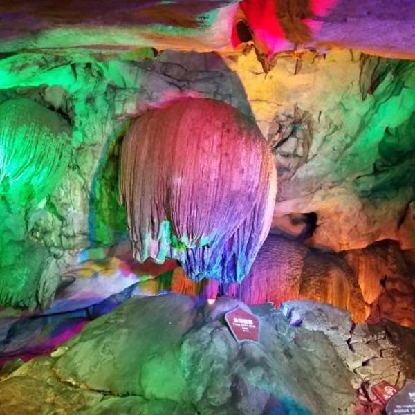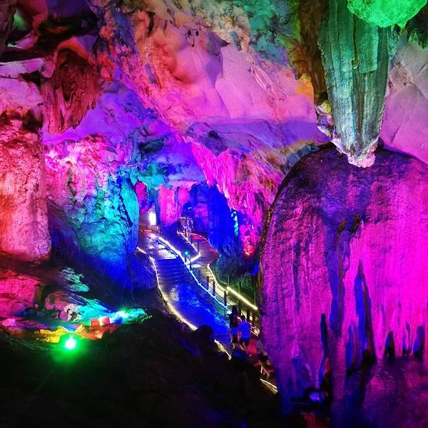 洞内有形态各异的钟乳石,配上五彩缤纷的灯光照射,十分绚丽。