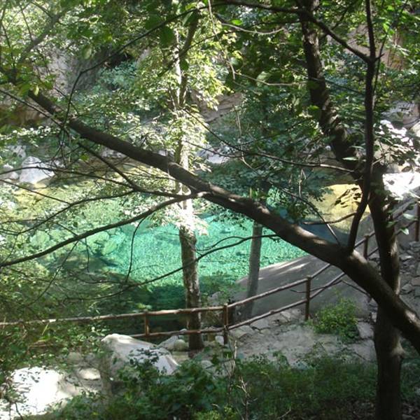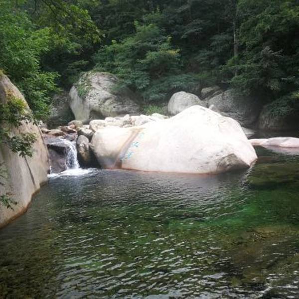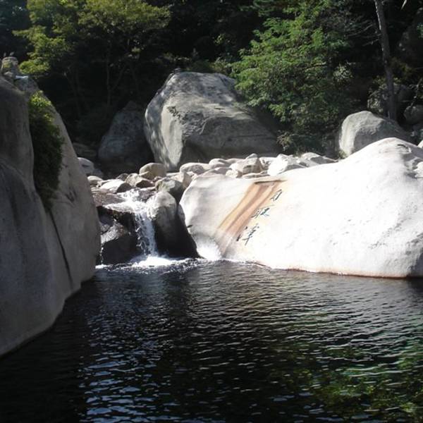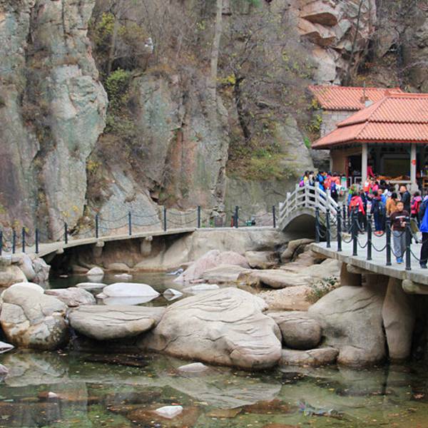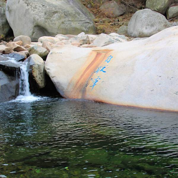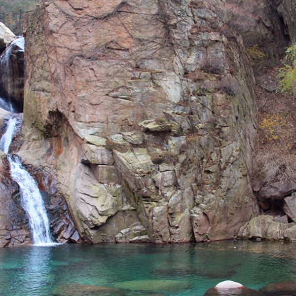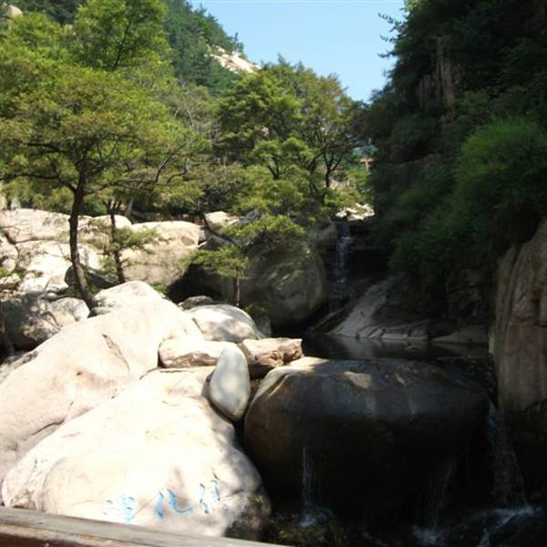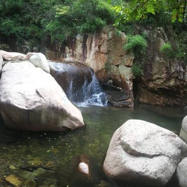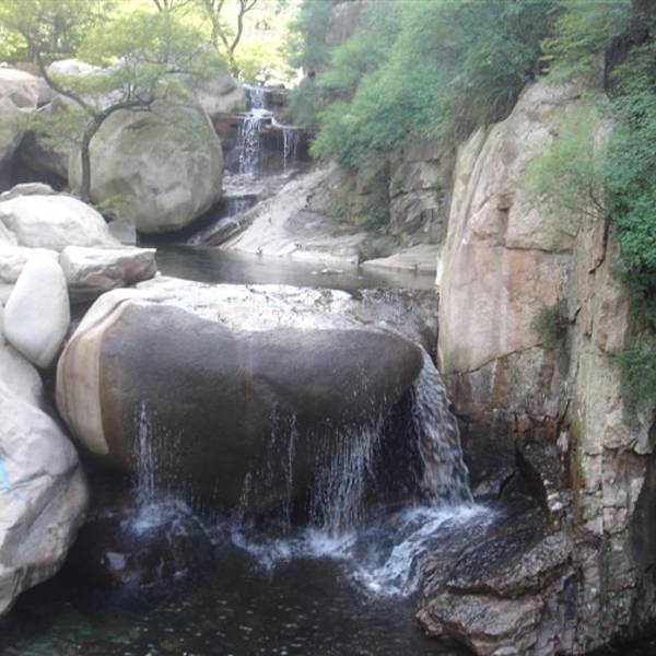 崂山九水游览区位于崂山风景区主峰的北部,是崂山风景区中罕见的以赏瀑亲水著称的游览区,也是有名的避暑之地。景区内植被茂密,山谷中遍布溪潭瀑布,山间随处可见惟妙惟肖的巨石,行走于水边栈道,碧绿清澈的潭水令人心旷神怡。 夏季是游览的好季节,此时的山谷中溪水潺潺,尤其雨后的瀑布水流量大,非常好看。夏季的景区林木葱郁、很是清凉,一路有溪水为伴,非常适合戏水。而十月至十一月中旬,则是来赏红叶的好时节,届时的山谷间五彩斑斓,景色也十分动人。 这里是由来自千米海拔的山泉汇流而成,它分为外九水和内九水。到达卧龙村后先买门票和观光车票,然后乘坐观光车经外九水(我乐村至太和观,约6公里路)到达内九水入口,开始徒步游览,而乘观光车途中可以看到公路边的水库、村庄、群峰,那些就是外九水的景观。 内九水(太和观至潮音瀑)则是整个景区的精华,汇集了众多景点,这一段路也比较好走,途中尤以“九水十八潭”为较大看点。“九水十八潭”是一连串大小不一的水潭,这些水潭清澈见底、碧如翡翠,潭间有巨石散落,如果夏季来此,可以在潭边戏水或在石上踏走,乐趣横生。 在这里一路沿着水流行走,会经过鱼鳞峡、冷翠峡等山间峡谷,还能看到多个巧夺天工的象形石,然后到达潮音瀑,可见一道山泉从峡口飞出,汇成一汪蓝绿色的水潭“靛缸湾”。潮音瀑是内九水的尽头,到了这儿可原路返回,也可继续登山至留韵亭、蔚竹庵,再下行至内四水返回。 上山的路以石阶为主,从潮音瀑到留韵亭的这段山路比较陡峭,比之前要更耗体力。不过当你登上留韵亭环望四周群山秀色时,你会觉得登上山是值得的。留韵亭是登山路的较高点,是一处海拔670米的观景台,天晴时从这里南望,能清晰地望见巍峨的崂山风景区主峰——崂山巨峰游览区。 留韵亭之后将是一连串的下山路,你将穿过一片松林,到达蔚竹庵。蔚竹庵建于明万历十七年(1589年),由全真教华山派道士宋冲儒所建,这座道观深藏山间,宁静朴实而充满道骨仙风,别忘进去看看。从蔚竹庵返回到内四水(即内九水的中途)后即可回走至观光车停车场。