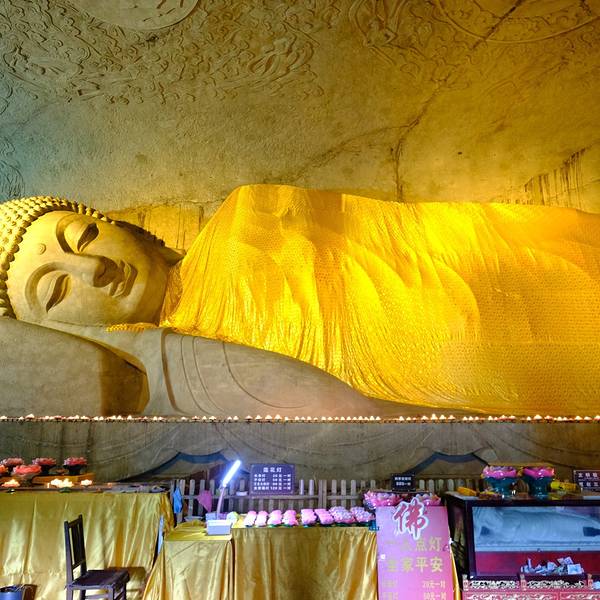 在大佛殿看江南最古老的石窟大佛,还有金碧辉煌的弥勒塑像。
