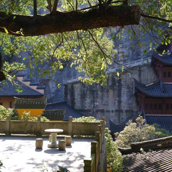 新昌大佛寺始建于东晋,坐西朝东,全寺以石窟造像为特色。