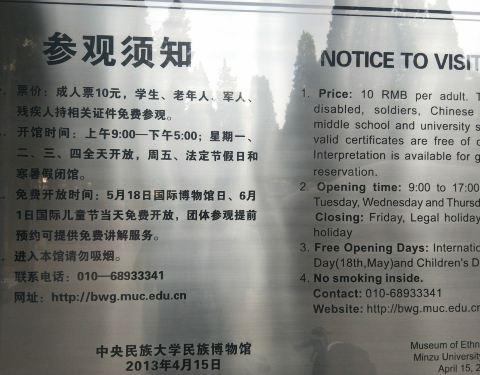 中央民族大学民族博物馆位于图书馆前侧。这里也是一个少数民俗服侍文化习俗展示地。以前是需要门票10元才能进入的,现在已经免费开放了。开放时间上午9点至下午5点。和一般馆周一闭馆有区别,这里只有周一到周四开放。周五、周末、法定节假日和寒暑假闭馆,应该是和学校智能部门上班时间有关吧。有时间经过的朋友可以看看。