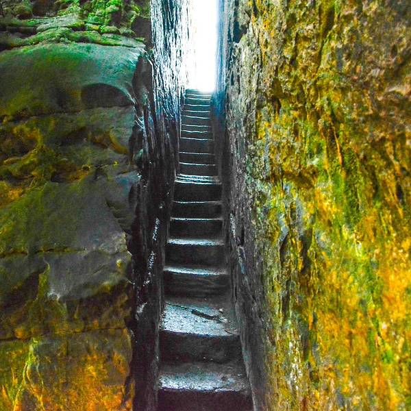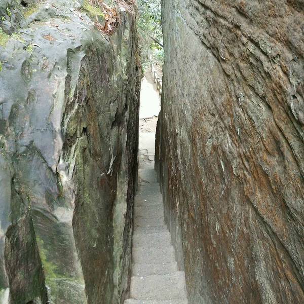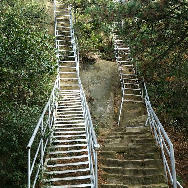 夫妻岩位于山峦顶部一石峰之巅,好似紧相依偎的两颗人头浮雕,五官俱全,一个笑意绵绵,一个表情沉稳,二者像是裹在一个大风衣里,把万千情意彼此传送。这对“夫妻”已在此屹立了万亿年之久,斗转星移,风吹雨打,忠贞不移。