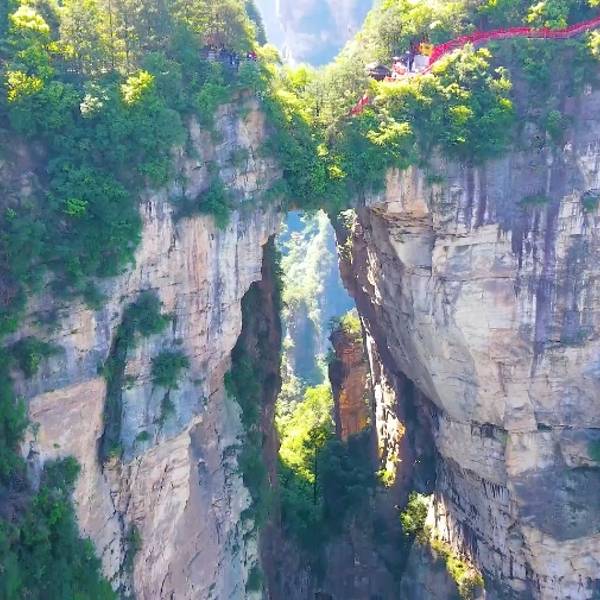 天下第一桥是张家界“十大绝景”之一。也是袁家界的标志性景点,它是居于两山之间形成的一座天然石桥,而两山原为一体,桥身是两山相连的关键部分,但因中间石质较为薄弱,由于风化、崩塌作用的影响,又经过日晒雨淋、流水洗刷、山洪冲击,久而久之,终于形成今天这一特别的奇景。