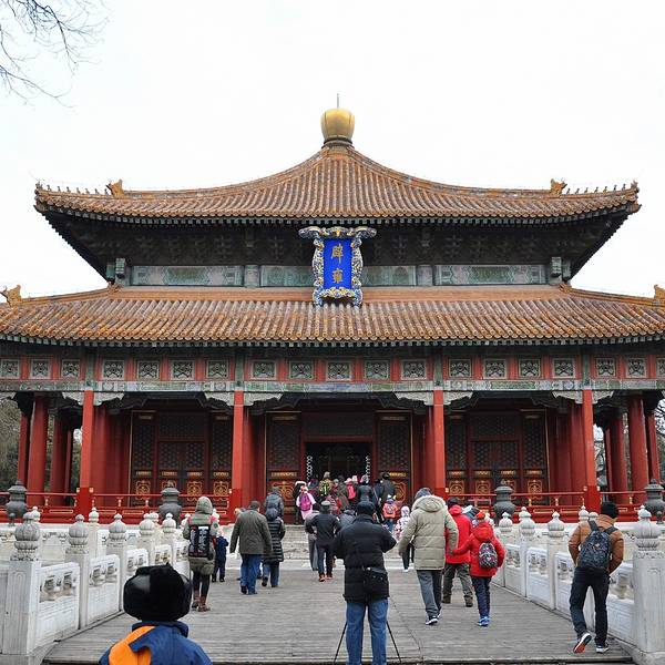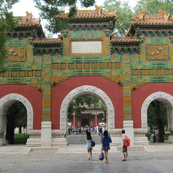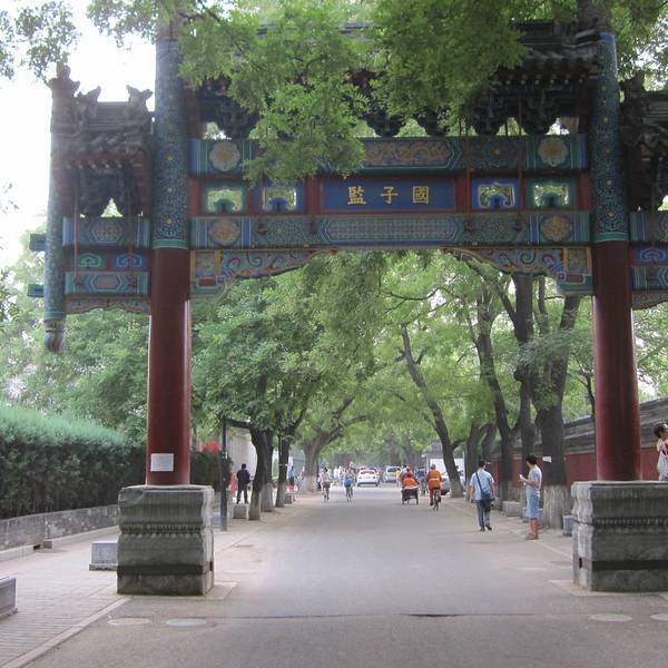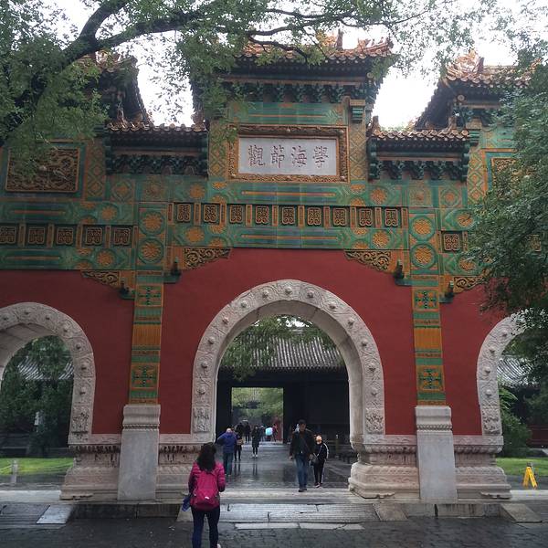 国子监是我国明、清两代国家管理教育的高衙门(类似如今的教育部)和国家设立的的高学府,也称“太学”。目前国子监与隔壁的孔庙统一售票,游客购票后进入孔庙,在碑亭旁的“持敬门”进入国子监游玩。国子监采用了中国传统的“坐北朝南,中轴对称”的建筑格局,中轴线上分布着集贤门(大门)、太学门(二门)、琉璃牌坊、辟雍大殿、彝伦堂、敬一亭等主要建筑。其中辟雍大殿整个国子监的中心建筑。辟雍大殿:皇帝讲学之处辟雍大殿这一个十分独特的建筑,是一座建于圆形水池中央的方型殿宇。这种建筑形制有这很深的含义:辟雍外环绕的圆形水池,环水为雍(意为圆满无缺),圆形像辟(辟即璧,皇帝专用的玉制礼器),象征这王道教化的圆满不绝。其它主要建筑:辟雍大殿以北是彝伦堂,早年曾是皇帝讲学之处,兴建辟雍大殿后,这里改为了国子监的藏书处。彝伦堂的北边是敬一亭,建于明嘉靖七年(公元1528年),是国子监官员办公的地方。国子监的琉璃牌坊,是北京的一座不属于寺院的琉璃牌坊,牌坊正反两面的横额上,都是乾隆皇帝的御笔题字,由此可见古代中国的崇文重教。在国子监内设有“中国古代科举展”和“国子监原状陈列展”等常年展览,对科举制度感兴趣的游客可以去参观。相比较北京一些景点的熙熙攘攘,国子监内古树林立,游客也不是很多,环境非常清净。国子监周边的胡同区也很不错,绿树成荫,四合院灰墙青砖,沿街有许多的茶艺馆,文房四宝,佛物商店等。