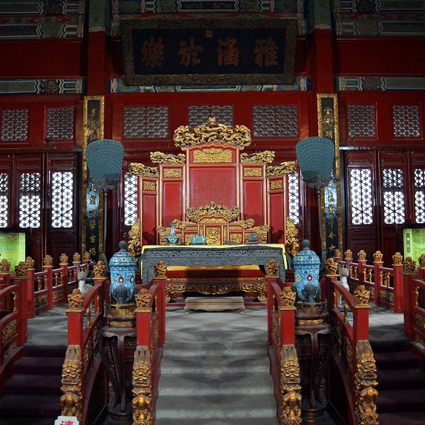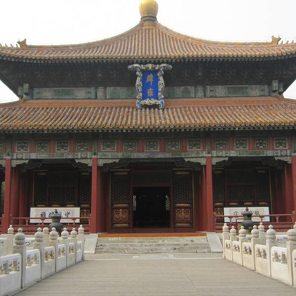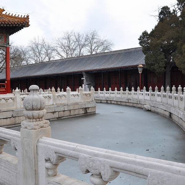 辟雍是国子监的中心建筑,是北京“六大宫殿”之o辟雍古制曰“天子之学”。国子监辟雍建于清乾隆四十九年(公元1784年), 是我国现存唯一的古代“学堂”,是皇帝临雍讲学的场所。其建筑风格独特,为重檐黄琉璃瓦攒尖顶的方型殿宇。外圆内方,环以园池碧水,四座石桥能达辟雍四门。构成“辟雍泮水”之制,以喻天地方圆,传流教化之意。殿内为窿彩绘天花顶,设置龙椅、龙屏等皇家器具,以供皇帝“临雍”讲学之用。