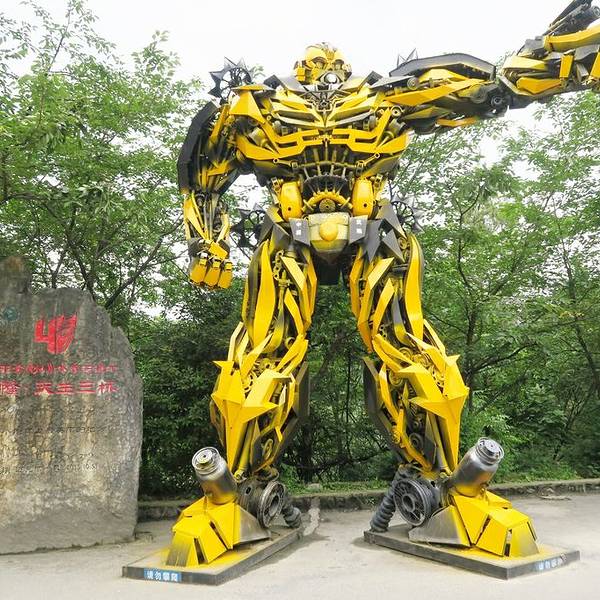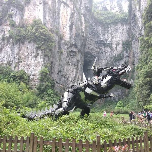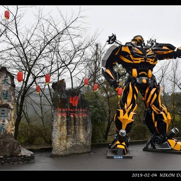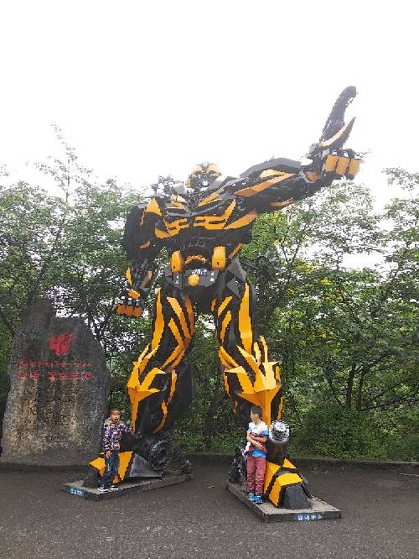 过了天龙桥往前走不了多远,就会来到一个山谷间的天然“广场”,广场中间又是矗立着一座变形金刚的雕像,也有不少游客同它合影。
