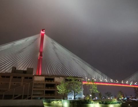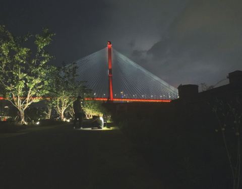 不得不多特别喜欢夜色中的杨浦大桥,而且尤其是在这样一个阴天,层层云朵的压迫感谢,杨浦大桥的红色显得特别突出,仿佛一部科幻大片出现。在走近一点看,斜拉索柱高聪挺拔,但夜色中特别的光影效果下,又好似一根巨大鱼骨,真是太美了