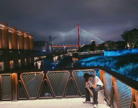 杨浦大桥如今在浦江美化工程下 夜景的层次一下上不少台阶 也终于和杨浦 卢浦一样有了属于自己的夜色效果又 下面的浦江岸线经过一定的改造也更亲水亲民 吸引很多市民前来休闲观光 并保留了一点工业元素