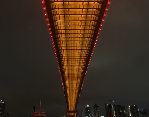 上海的标志性景观 作为内环高架的组成部分 建成的时候更是同类型的世界之最 红色的油漆配合桥塔在夜晚新的灯光亮化工程后看上去十分的威严和充满力量 作为连接东部跨江的主干道 平时的车流量也十分的大 很多人喜欢在这里开车时看着西侧陆家嘴的黄昏 真的很漂亮