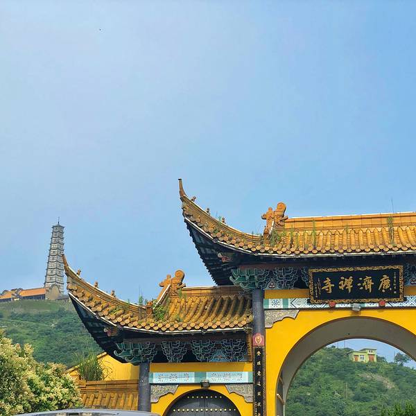 山上建有洪福(广济上寺)、普庆(广济中寺)、洪因(广济下寺)三寺,其中以普庆寺最为宏伟,有建筑面积1201平方米,大殿高9米,青瓦飞檐,雕梁画栋。大殿内的观音像高达6米,两旁三十六观音化身像全用大理石雕成。千佛殿内用汉白玉精雕的千尊玉佛,三面八层依壁列座,玉质晶莹,雕工细腻,堪称艺术珍品。