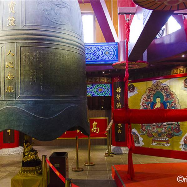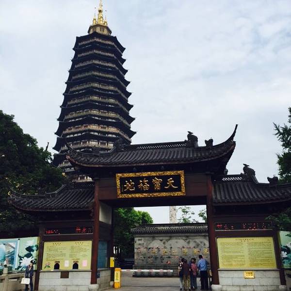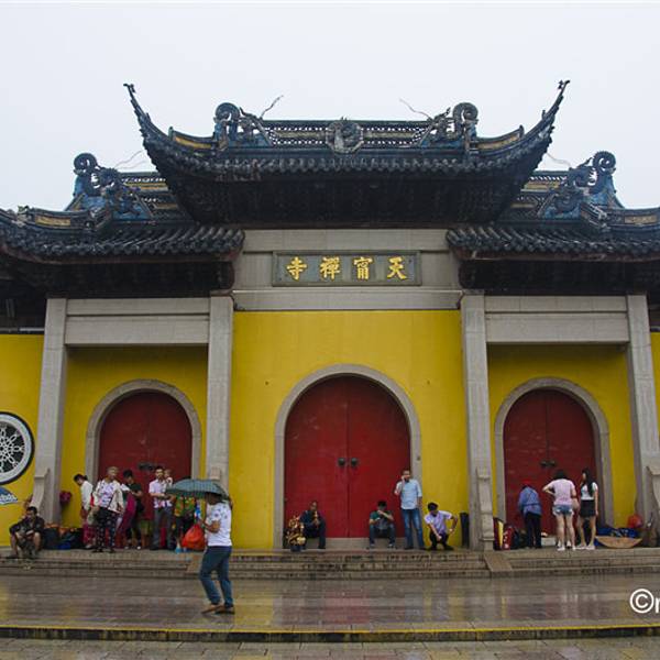 天宁寺始建于唐贞观年间,是佛教音乐梵呗的发源地之一,现在是常州很大的寺庙,以“殿大、佛大、钟大、鼓大、宝鼎大”为特点,仅说大雄宝殿就有十层楼那么高。寺庙内的天宁宝塔建成于2007年,是常州地标之一。该寺北靠常州第一大公园,南临,距离、常州汽车客运站仅1.5公里。寺庙的主体建筑沿南北走向的中轴线排布,正大门开在南端,从南到北依次为山门、天王殿、大雄宝殿、玉佛殿、三宝殿。殿东西两侧分别为文殊殿、普贤殿。大雄宝殿东西两侧分别为观音殿、地藏殿。天王殿与大雄宝殿之间的广场两侧分别是东罗汉堂、西罗汉堂。玉佛殿东侧为、上客房,西侧为僧房。中轴线的西侧其他还有佛教学院、学戒堂、、达摩阁等建筑。其中天王殿和大雄宝殿以“大”著称,气势宏伟。殿高23米多,里面供奉的四大高7.8米,在国内的佛像中算是非常高大的。大雄宝殿高33米,殿前有两块日晷,殿内正中供奉三世佛,背后是海岛观音,二十诸天分立两侧,大殿右前角有一口重达4吨的巨钟,左前角有一面直径约2米的大鼓。该寺的北端是天宁宝塔,塔前立着一对白色九龙柱和两个巨大的福禄寿香炉,塔基围绕着一圈四大和8头大象铜塑。塔的地下有地宫,地上有十三层,塔尖是金光闪闪的金刚宝座型塔刹。塔中的大柱、栏杆、吊顶、楼梯、扶手、门槛等全部使用楠木,每一层根据不同的主题展出不同的佛教珍宝,佛像、图腾、根雕等都非常精美,相当于一座佛教博物馆。天宁宝塔内有电梯可达12层,建议坐到12层,然后步行到顶层,再一层层走下来参观。第五层使用数吨沉香雕刻而成的法界源流殿,第十二层供奉有历代名贵香樟木古佛的古佛殿,第十三层供奉“镇塔之宝”天然水晶佛的十方圆融殿,都不容错过。塔顶还有一口重15吨,高118米的大钟,撞钟三下要几百元,价格较贵。天宁宝塔同时也是登高观景的好去处,常州城景、这里和的全景尽收眼底。每年的12月31日这里会举办撞钟迎新活动。在重大佛教节日前往,可以听到著名的天宁梵呗,当年徐志摩到陆小曼的家乡常州做客,在这里听过梵呗后写下了《闻礼忏声》。该寺山门东侧的如意素斋馆可吃素斋,素面挺受欢迎的。寺内有多处法物流通处,普贤殿左侧,文殊殿右侧,三宝殿两侧,天宁宝塔西侧的附近,天宁宝塔内都可请法器。参观完这里可到紧挨着的散散步,也可以步行到附近的文化宫商业街逛街,或是到坐游船游。