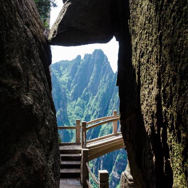 黄山山体主要由燕山期 花岗岩构成,垂直节理发育,侵蚀切割强烈,断裂和裂隙纵横交错,长期受水溶蚀,形成瑰丽多姿的花岗岩洞穴与孔道,使之重岭峡谷,关口处处,全山有岭30处、岩22处、洞7处、关2处。