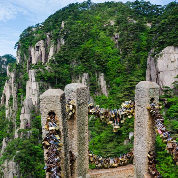 黄山代表景观有“四绝三瀑”,四绝:奇松、怪石、云海、温泉;三瀑:人字瀑、百丈泉、九龙瀑。黄山迎客松是安徽人民热情友好的象征,承载着拥抱世界的东方礼仪文化。