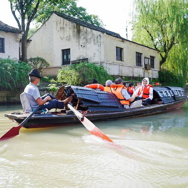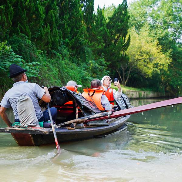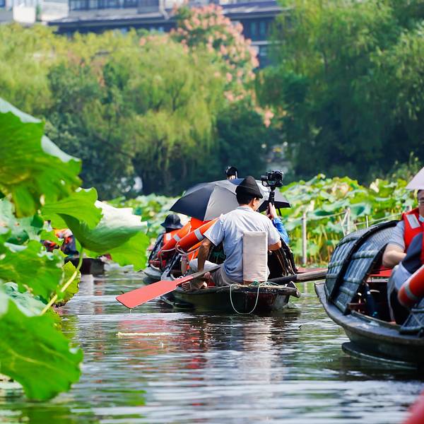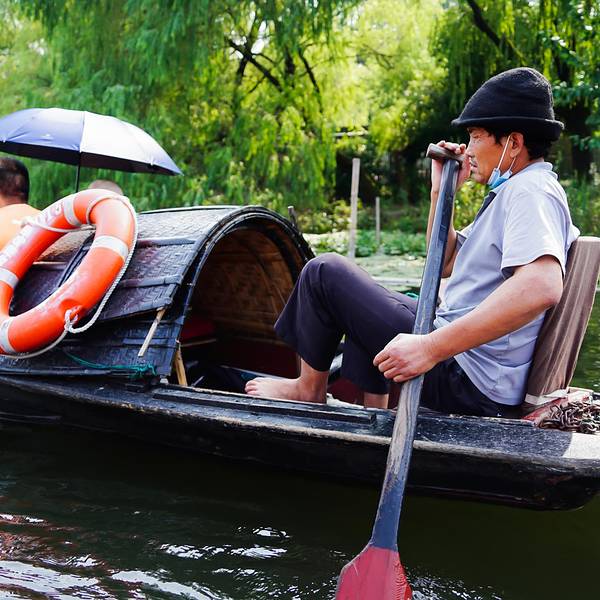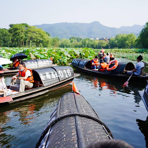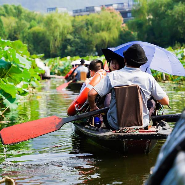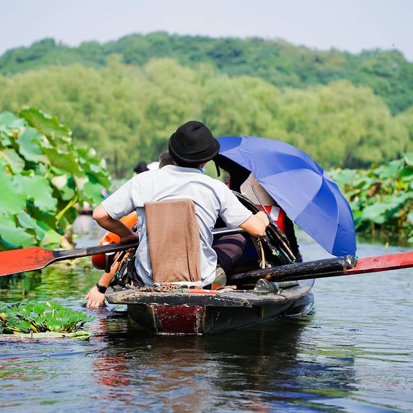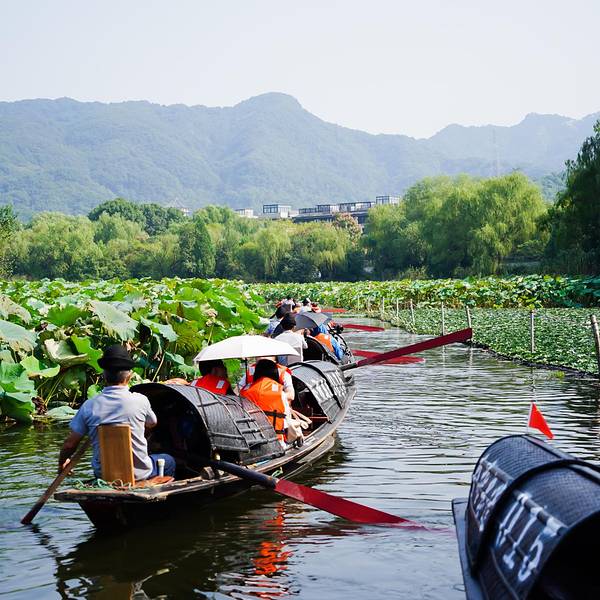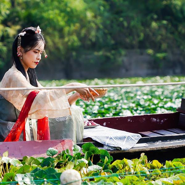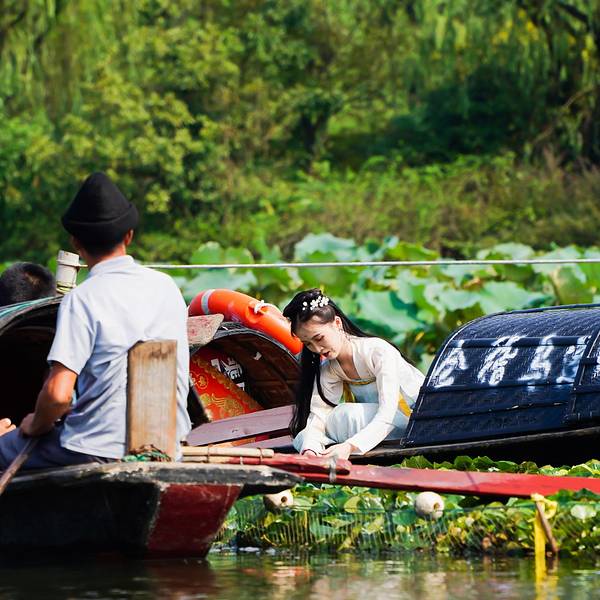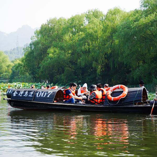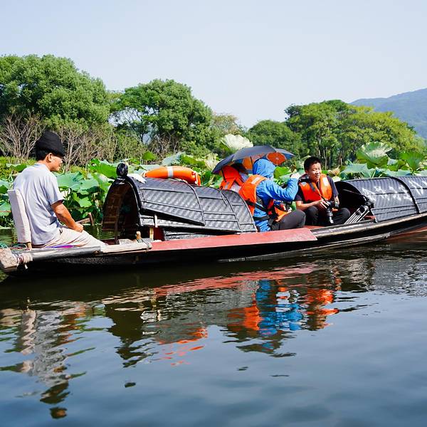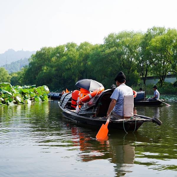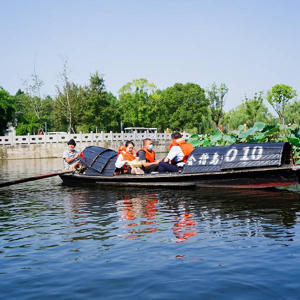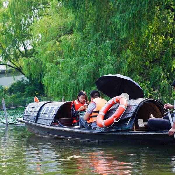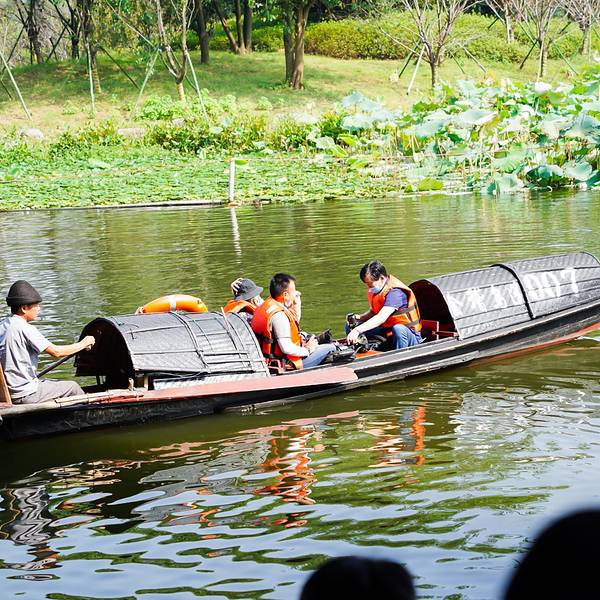 来这儿,可以坐一下这儿的乌蓬船,现在也是采菱的好时节,船夫手脚并用,掌握着船的方向与行进速度,来到采菱地,可以新手采几个吃吃,时令货,非常新鲜。