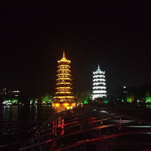 3-个人感受:我们没有乘船,嘻嘻,比较贵呢!我们主要是在日月双塔游玩了呢!感觉也不错。晚上的日月双塔别具一格。我们去那天月亮特别的量,小伙伴们就尽情的展开想象了。桂林的米粉真的很好吃啊,我们住的地方门口有一家连锁的3.5元,好好吃啊!看双塔公园里的垃圾桶,很有喜感吧~吼吼~ 展开