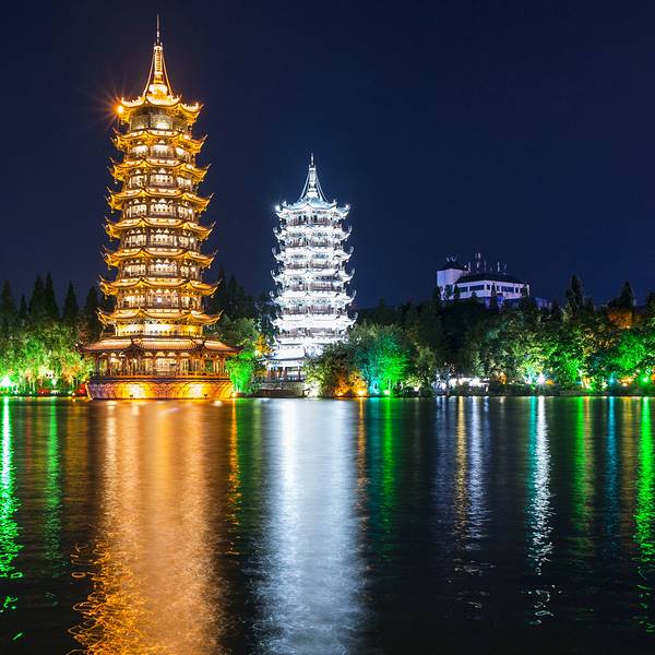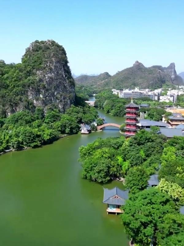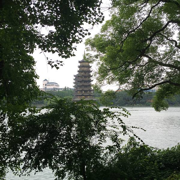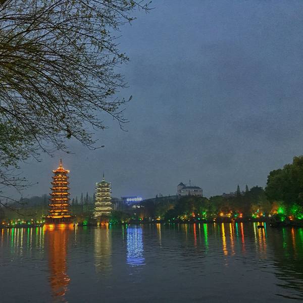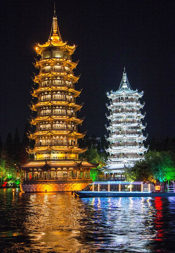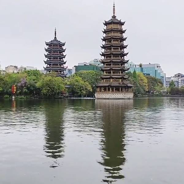 沧海桑田,到了近代两江四湖景区的湖塘却有一些被填没,经过三年多的修建才在02年重现了当年的美景;如今游客来到两江四湖景区,最舒适的玩法便是乘坐游船夜游两江四湖,在船上可以近距离看到日月双塔和沿湖美景,也是桂林山水之外的独特享受。两江四湖景区的面积很大,但核心区域便是日月双塔所在的这个湖面,从古桥下来之后沿着湖边前行,无论哪个角度都能看到双塔的美景;日月双塔距离象鼻山不远,两个景区相互呼应,成为了桂林一老一新两个地标。不过,我却发现一个问题,就是在两江四湖景区游玩的时候,坐游船欣赏景色还不如直接走岸边看着美,而且游船190元的门票是很多人坐一个船,吵闹不堪也没有什么优点。当然,这个游玩项目是看大家自己的爱好,喜欢也没什么毛病,嘿嘿!日月双塔中的日塔高41米,为纯铜打造,而月塔明眼能看到低一些,为35米的琉璃塔;如果需要登塔的话,则购买一张门票即可,有通道连接,个人认为月塔这种风格更漂亮一些,有点梦幻的感觉,你认为呢?两江四湖景区很受游客欢迎,晚上湖边人山人海走不动路,小心被挤到湖里去,游玩时注意安全~门票信息:游船190元每人,登日月双塔28元。