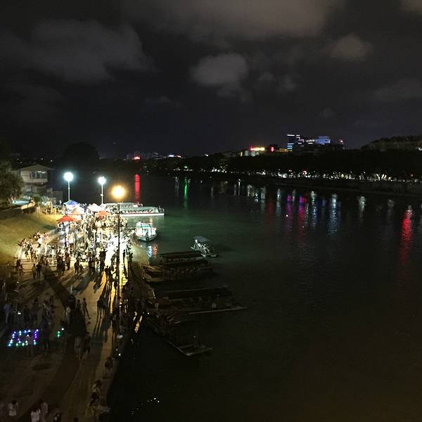 比云云早到半天,放下行李马上吃了一碗螺蛳粉,然后开始闲逛,除了两江四湖,桂林还有个象鼻山,因为酷似一头伸着鼻子汲饮漓水的巨象,韩愈的“江作青罗带,山如碧玉簪”描绘的也是这一带,位于市中心的象山公园,从两江四湖步行过去也不远,但是门票比较贵,我们去的季节漓江水位很低,我们就沿着漓江转了一下,想着要去兴坪坐排筏游漓江。