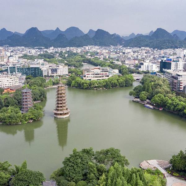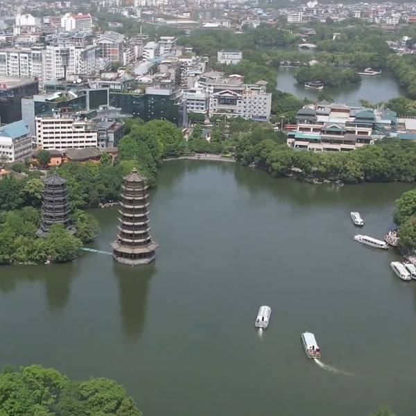 两江四湖是指由榕湖、杉湖、桂湖、木龙湖、漓江、桃花江所构成的桂林环城水系,是桂林城市中心最优美的环城风景带。水上游览桂林兴于唐代、盛于宋代,当时桂林城中,湖塘密布,水系发达,乘一叶小舟可尽览城中风景名胜。桂林两江四湖环城水系重现昔日兴盛,形成了一条与威尼斯媲美的环城水系,堪称中国一绝。