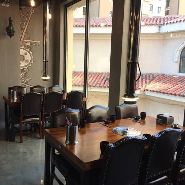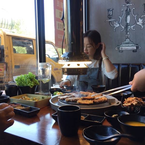 座位非常的舒服朋友两两对座,烤肉炉和排烟气的管子巧 妙的灯光影照下显得非常独特,桌面和临街的窗子非常明亮干净整洁优美。不知道烤肉的味道咋样了……