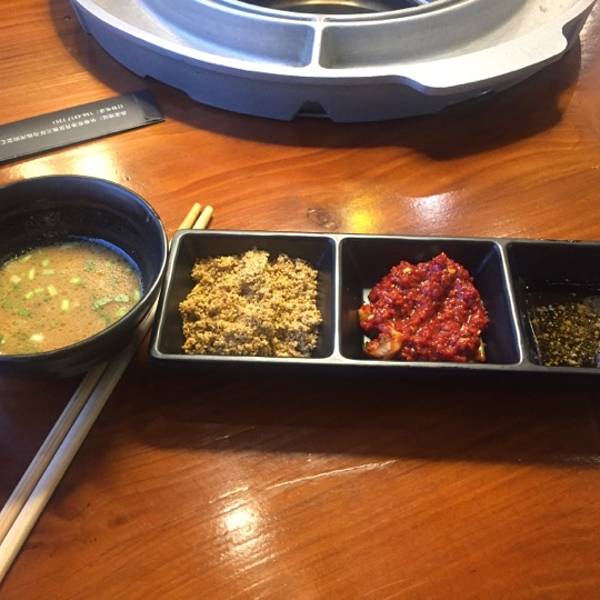 不一会儿服务员端上来了一排三样蘸料和一个小碗里面好像芝麻酱的东西,不知道是什么肉在熊熊燃烧的炭火上,用一种钢网上开始由服务员精心烤制,不知不觉闻到了肉味的香,味道真的很诱人。