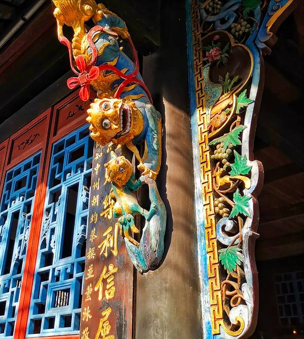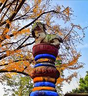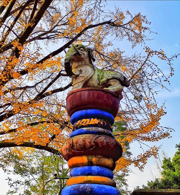伏龙观有那么几个地方让我印象比较深。再有就是那一尊飞龙铁鼎,基本上是完全生锈的伏龙观有那么几个地方让我印象比较深。一个是建筑物前面两排的名人塑像,其中有一个是诸葛亮。然后是在建筑物进门的李冰石塑像。再有就是那一尊飞龙铁鼎,基本上是完全生锈的。