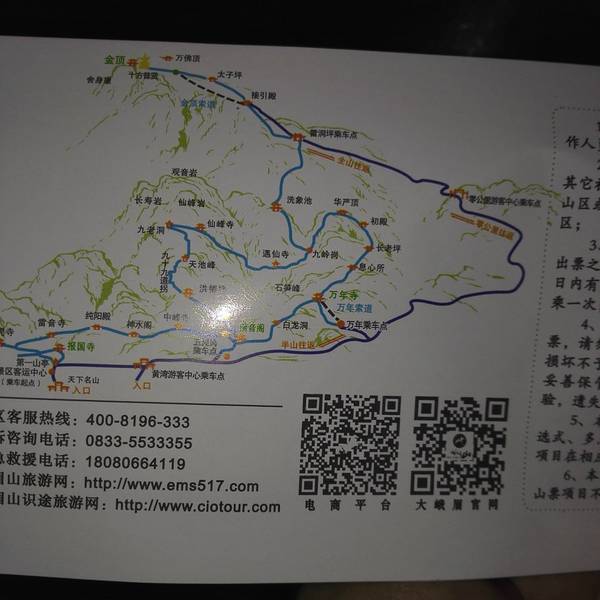 【下山路线】经过万年寺,;万年寺为峨嵋山八大寺庙之一,全国重点寺院之一,有无梁砖殿、巍峨宝殿、白水池等景点;目前,万年寺附近有万年停车场与万年寺有索道相连,故很多前来峨眉山旅游的游客都把万年寺作为自下而上正式登山的起点之一;另外一些游客则把这里作游山结束的终点;此外,浙江天台山有同名寺院,历史亦同样悠久。过了万年寺到了生态区,登山过程中遇到了猴子,小猴非常灵敏,如果你是那塑料袋的猴子会直奔塑料袋冲去寻找食品。这里的猴子都比较胖主要是游人喂食的太多了。沿途自然景观不错风景秀丽。到达金顶处后可以欣赏这里的建筑及整个地区的风貌,时时会飘过云朵在脚下的山丛中,非常值得一游,下次还会再来。